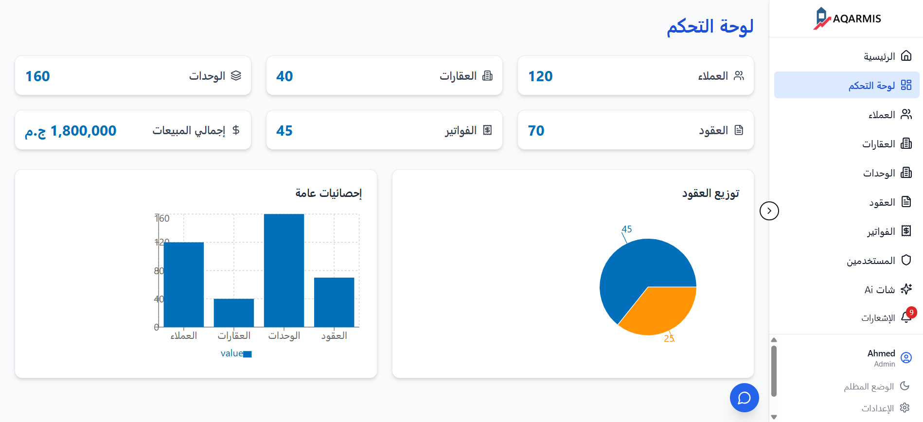 Aqarmis is a modern real estate CRM platform that helps developers, agents, and accountants manage properties, clients, contracts, and invoices in one intelligent dashboard.